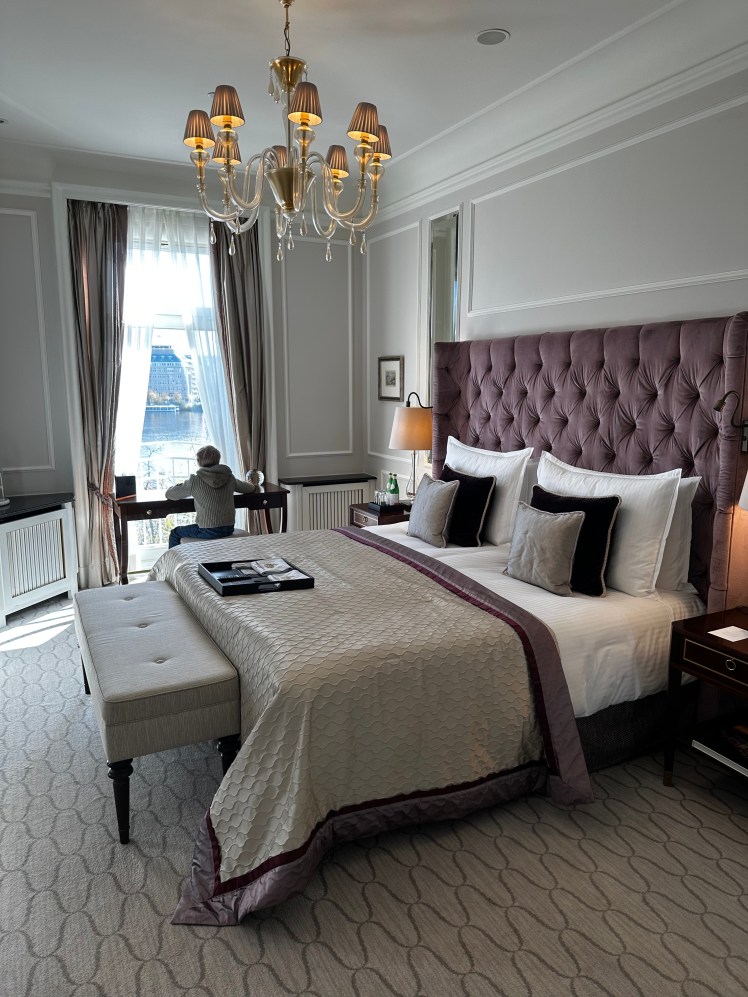 Unsere Alster Suite mit der Nummer 200 war ein Highlight für sich. Mit ihrer eleganten Einrichtung, der spektakulären Aussicht auf die Binnenalster und den kleinen Details wie der Begrüßungskarte, dem Gas-Kamin und den handgemachten Pralinen, fühlten wir uns in eine Welt des Komforts und Luxus versetzt. Die Doppeltür, die unsere Suite abschloss, verstärkte das Gefühl, etwas ganz Besonderes zu erleben. Vincent fand seinen Lieblingsplatz direkt am Kamin, und wir genossen die ruhigen Momente mit Blick auf die glitzernde Alster.
