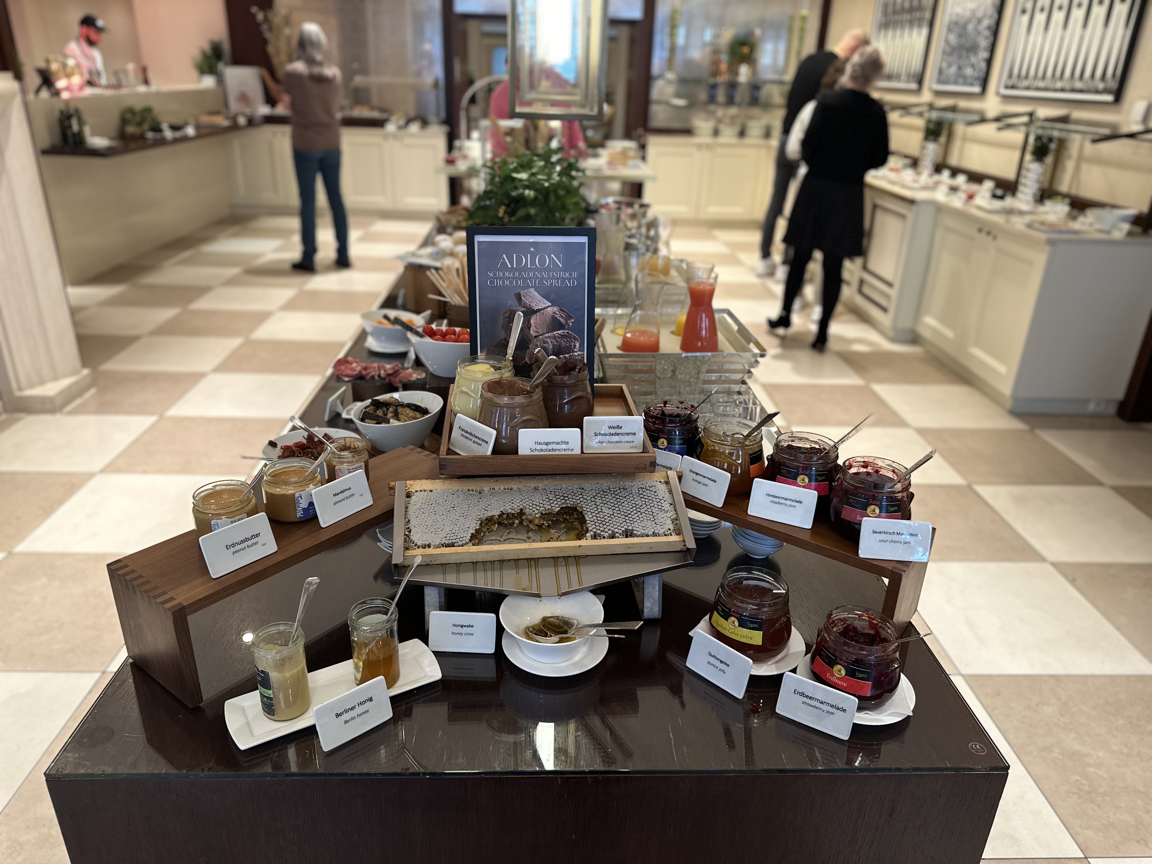 Die wirklich so noch nicht erlebte, besondere Vielfalt an Speisen, aber auch die außergewöhnliche Atmosphäre, haben unsere Tage immer mit einem besonderen Glücksgefühl aber auch Dankbarkeit, starten lassen. Dazu bietet die Bel Etage einen einmaligen Blick auf die Lobby und den legendären Elefantenbrunnen. Die gesamten Räume sind elegant eingerichtet und verströmen einen Hauch von Geschichte und Glamour. Das Personal ist sehr freundlich und zuvorkommend und sorgt dafür, dass wir uns und auch jeder andere Gast, einfach besonders fühlt. Das Frühstück war für uns jeden Morgen mehr als nur eine Mahlzeit, es ist ein Erlebnis, das man nicht so schnell vergisst. Auf den folgenden Fotos bekommt ihr einen Eindruck von der Vielfalt und Liebe.
