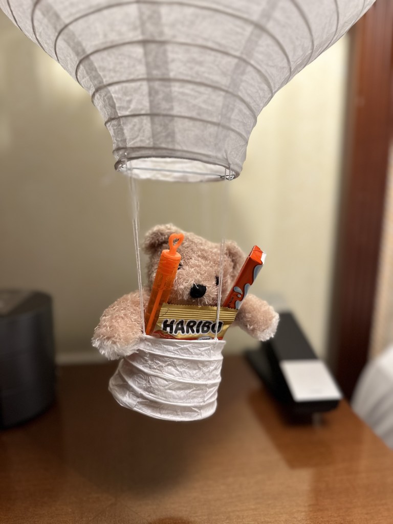 Ein knuffiger, kleiner Bär fliegt im Heißluftballon und mit Süßigkeiten in Vincent´s Bett. Die Freude war riesig bei ihm