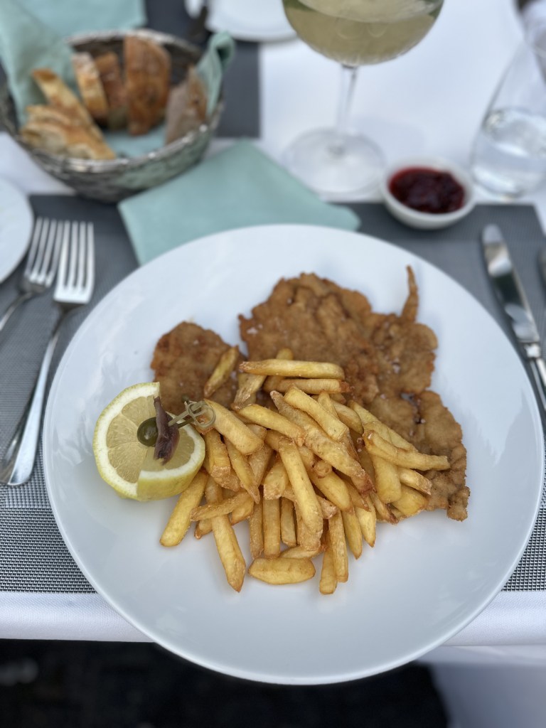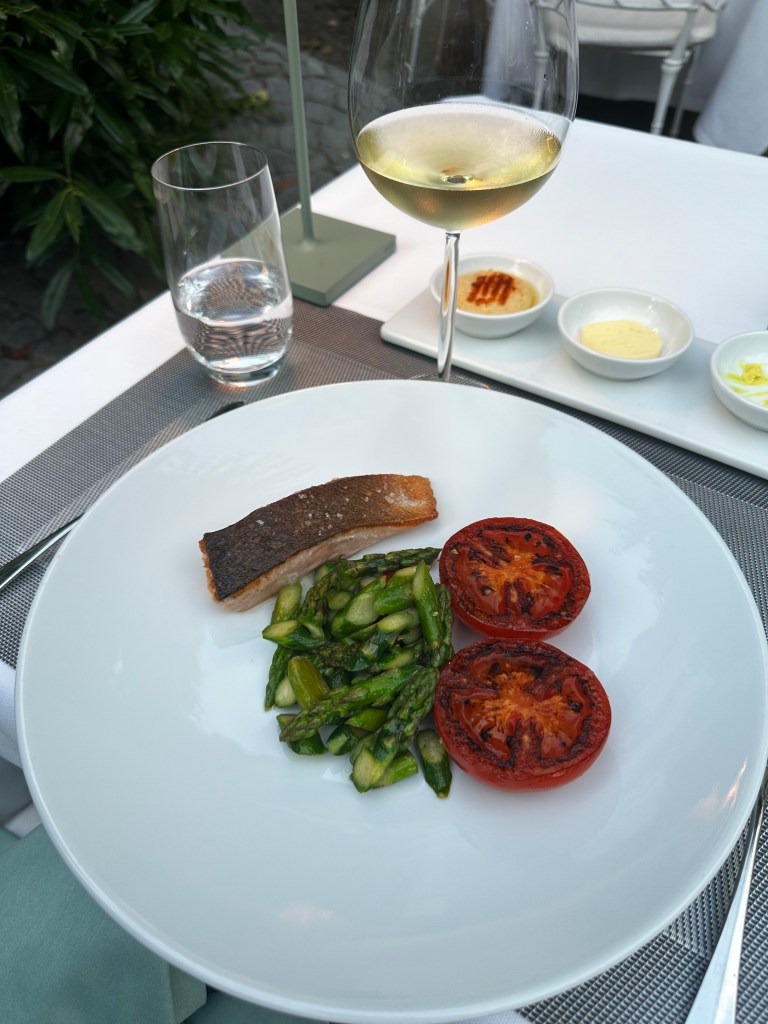 Die Sonne taucht die Umgebung in warmes Licht, und wir nehmen an einem der gemütlichen Tische Platz. Die Speisekarte des Sommerrestaurants ist eine Hommage an die mediterrane Küche: leichte, frische Gerichte, perfekt für einen warmen Sommerabend. Meine Frau wählt gegrillten Lachs, begleitet von grünen Spargel und einem herrlichen Glas kühlen Weißwein. Ich hingegen genieße das “Schnitzel” – absolut empfehlenswert! Die Speisekarte lässt keine Wünsche offen.